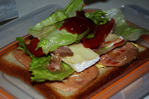 食毕临睡,杨同学发表了重要讲话:三明治味道还不错,八十分。第二天杨同学走后到本文发布之间,我又不断探索新的食品加工方式。譬如将包菜叶换成黄瓜片;或者直接买生的培根片,烘培烤熟后替代午餐肉口感更佳;或者加一些猪肉松……等等。进而我总结出:只有想不到的,没有做不到的;发挥想象,将一切可以食用的东西放在面包之间,有时候会收到意想不到的效果。